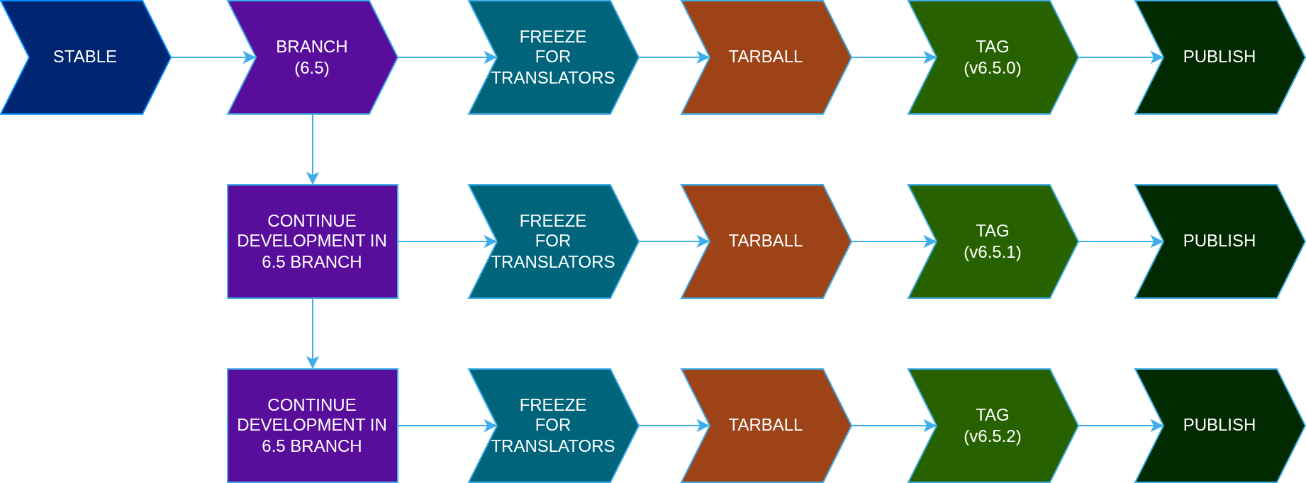 Because of this release workflow, you are now able to work on the master branch for the development of the next 6.6.0 release and continue shipping point releases for your users of the 6.5 branch.