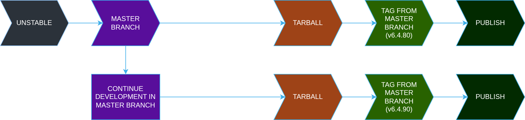 Unstable releases on the other hand do not require branching since you can use snapshots of the master branch to create new tags and subsequently tarballs. Tags should use .70, .80 or .90 at the end of the versioning name for alpha, beta and release candidates, respectively. For example: v6.0.80.